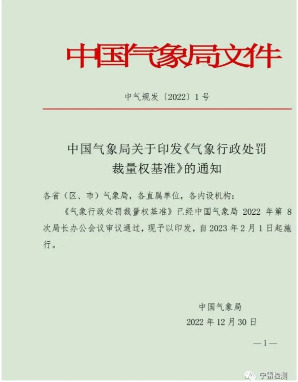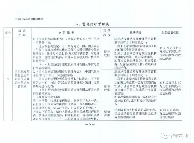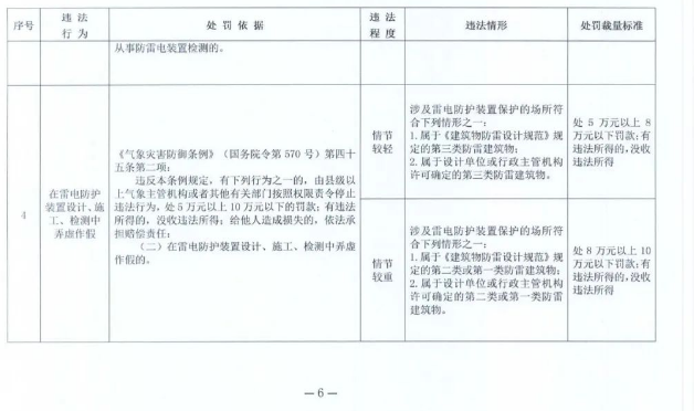 為了規(guī)范氣象行政處罰裁量權(quán)行使,促進(jìn)依法、合理行政,維護(hù)公民、法人和其他組織的合法權(quán)益,依據(jù)《中華人民共和國(guó)行政處罰法》、《氣象行政處罰辦法》等法律法規(guī)規(guī)章和《國(guó)務(wù)院辦公廳關(guān)于進(jìn)一步規(guī)范行政裁量權(quán)基準(zhǔn)制定和管理工作的意見(jiàn)》,結(jié)合氣象工作實(shí)際,中國(guó)氣象局制定了《氣象行政處罰裁量權(quán)基準(zhǔn)》,自2023年2月1日起施行。其中第二款對(duì)雷電防護(hù)管理類氣象行政處罰裁量權(quán)基準(zhǔn)做出以下規(guī)定: